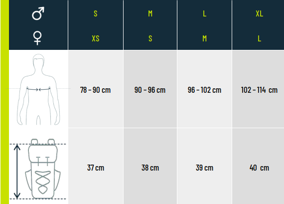 Les systèmes de fermeture au niveau de la poitrine et du ventre sont ajustables pour vous garantir un confort idéal et sur le côté se trouvent des cordons de serrage qui permettent d'adapter le sac à votre morphologie.