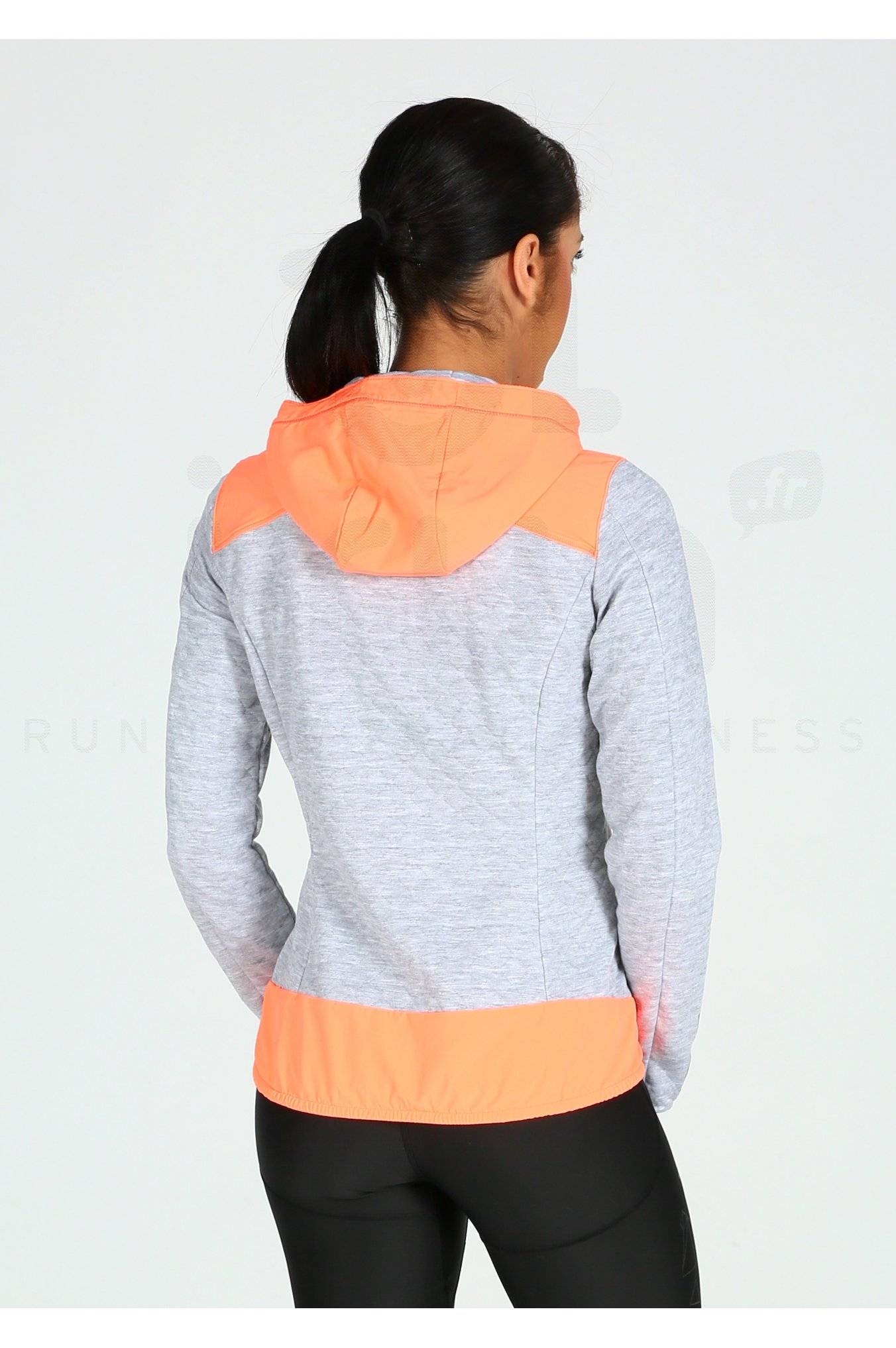 La capuche et son élastique de serrage assurent une défense supplémentaire contre le vent pendant votre session de course à pied. La veste Salomon Elevate FZ MID pour femme est dotée de poches latérales zippées dont une avec un passage pour votre fil d'écouteurs.