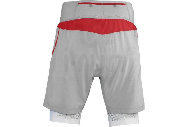 Le short Salomon 2 en 1 Exo S-Lab Twinskin (Collection Automne/Hiver) gris et rouge pour homme est un vêtement de running trail améliorant le placement des zones clés du corps lors de vos entraînements ou compétitions pour augmenter vos performances.